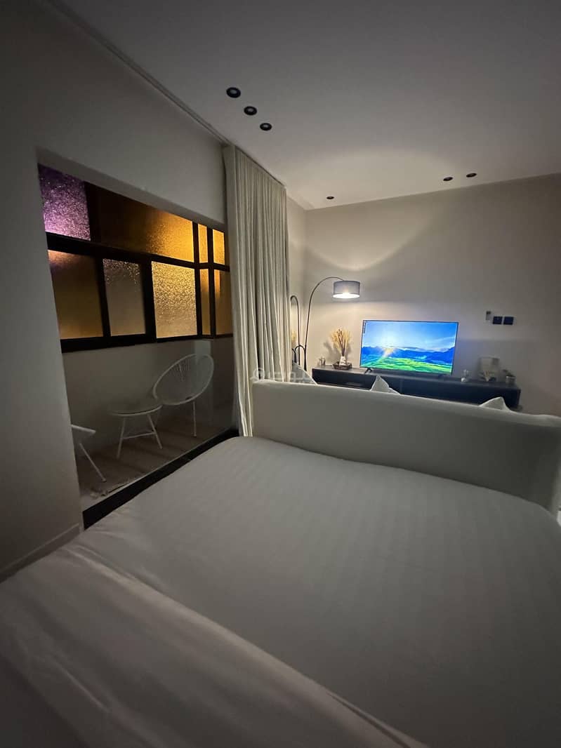 Distinctive studio has comfort and privacy, with a modern design and a location close to all services. The studio has a small balcony to enjoy the look, a modern TV screen, and a practical fridge. The toilet is fully equipped with all the supplies, as well as a comfortable master bed and an elegant side session with a wide coffee table, making it ideal for living in a modern lifestyle.