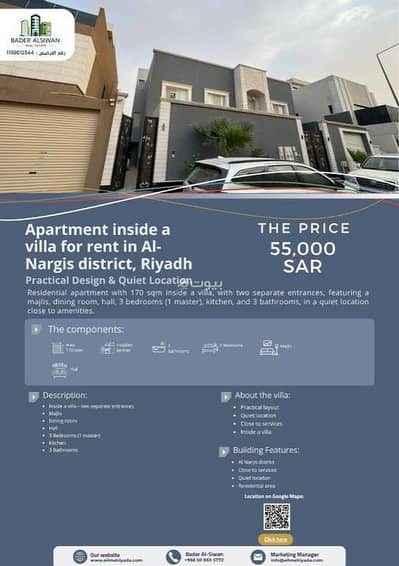 Welcome to this Studio Apartment located in the vibrant neighborhood of Al Narjis, Riyadh. This property offers an excellent opportunity for those looking for a comfortable living space in a desirable area. With a yearly rent of 55,000 SAR, it provides an affordable option for city living.