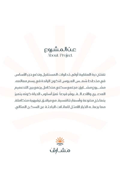 Apartments for residential and investment sale in the Mashariq project in the Shams Al-Arous layout in the Marikh neighborhood, located east of Jeddah city, close to all main roads and services in a site with complete infrastructure.