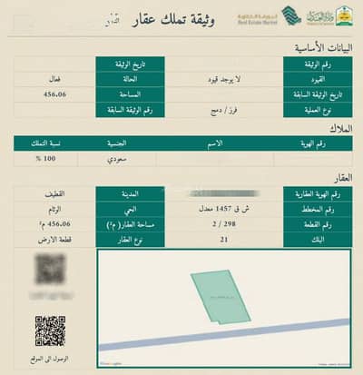 Residential land in the Al-Ghadir Oasis plan (approved plan number Sh Q 1457) plot number 298/2 with an area of 456.06 m², south-facing, priced at 1730.04 per meter, totaling 789,000. Other lands are available in different sizes.