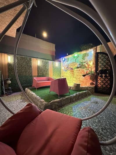 consisting of one bedroom and a large hall with a seating area and a dining table, a bathroom, and a distribution area, and a separate kitchen with a private entrance to the apartment, an external garden, a private parking space for the car, fully furnished with bedroom, kitchen, and seating area, there are split air conditioners, an oven, a washing machine, and a television.