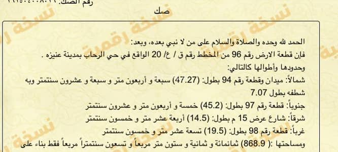 The location is fetched and verified by REGALocation Description as per Deed:حي الرحاب بمدينة عنيزه .