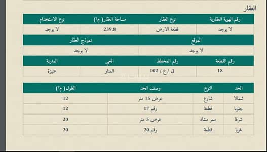 Plot number 18: Area: 239.8 m opens onto a street 15 m wide to the north for a length of 12 m and on a pedestrian path 5 m wide to the east for a length of 20 m.