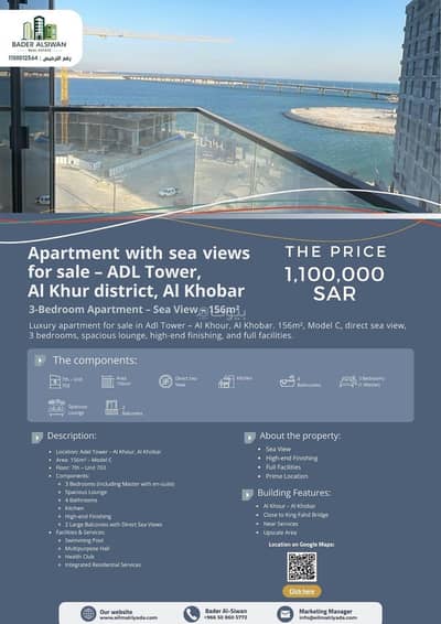 {"ar_to_en" => "Luxury apartment for sale with direct sea view in Adl Tower – Al Khour District, Al Khobar. \nArea: 156 sqm – 7th Floor, Unit 703\n High-end finishing + Prime location + Full facilities\n\n Features:\n\t•\t3 Bedrooms (including Master with en-suite)\n\t•\tSpacious lounge\n\t•\tKitchen\n\t•\t4 Bathrooms\n\t•\t2 Balconies with direct sea view\n\n Facilities & Services:\n\t•\tSwimming pool\n\t•\tMultipurpose hall\n\t•\tHealth club\n\t•\tIntegrated residential services\n\n Location: Al Khour – Al Khobar (close to King Fahd Bridge and all main services)\n Price: 1,100,000 SAR\n\n Contact: 0508605772\nReal Estate License No. : 1100012564\n More details at: www. eilmalriyada. com", "en_to_ar" => "شقة فاخرة للبيع بإطلالة مباشرة على البحر في برج عدل – حي الخور، الخبر\nالمساحة: 156 م² – الدور السابع (الوحدة 703)\n تشطيبات راقية + موقع مميز + خدمات متكاملة\n\n المواصفات:\n\t•\t3 غرف نوم (منها ماستر)\n\t•\tصالة واسعة\n\t•\tمطبخ مجهز\n\t•\t4 دورات مياه\n\t•\tبلكونتين بإطلالة بحرية مباشرة\n\n الخدمات والمرافق:\n\t•\tمسبح\n\t•\tقاعة متعددة الأغراض\n\t•\tنادي صحي\n\t•\tخدمات سكنية متكاملة\n\n الموقع: حي الخور – الخبر (قريب من جسر الملك فهد والخدمات الرئيسية)\n السعر: 1,100,000 ريال\n\n للتواصل: 0508605772\nرقم المعلن العقاري: 1100012564\n التفاصيل عبر موقعنا: www. eilmalriyada. com"}