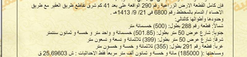 The location is fetched and verified by REGALocation Description as per Deed:كامل القطعة الارض الزراعية رقم 290 الواقعة على بعد 41 كم شرق تقاطع طريق العقير مع طريق الاحساء / الدمام بالمخطط رقم 6800 فى 21/ 9/ 1413هـ .