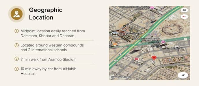 A Residential building designed for comfort and elegance, strategically located between Dammam, Khobar, and Dhahran. Close to western compounds and international schools, and just a 5-minute from Aramco Stadium.