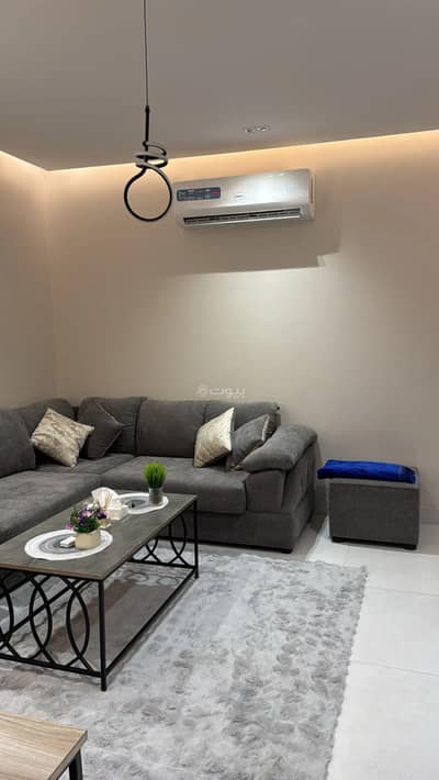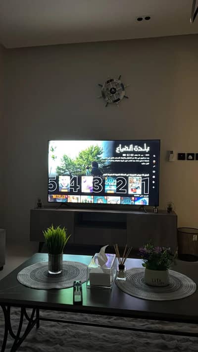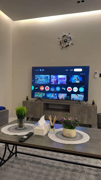 An elegant apartment that includes a living room with a QLED TV with additional lighting, and a bedroom