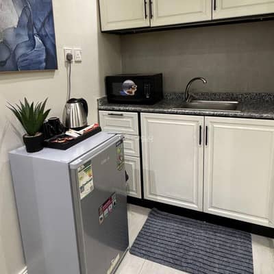 The kitchen contains a Saudi and American coffee machine, a microwave, and a refrigerator
