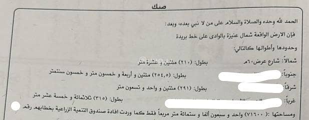 The location is fetched and verified by REGALocation Description as per Deed:الارض الواقعة شمال عنيزة بالوادى على خط بريدة