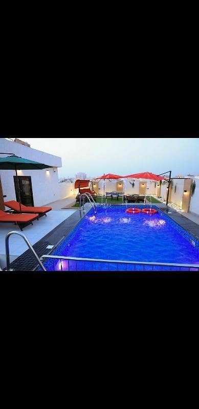 (There is a swimming pool on the hotel roof with outdoor seating)