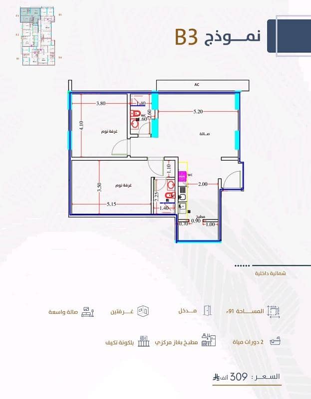 Two-bedroom apartment, interior, area 91 m², price 309,000 in Darb al-Haramayn plan.