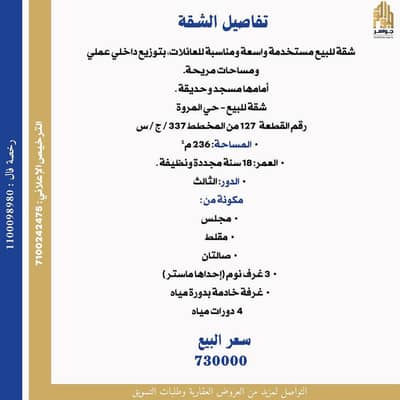Apartment for sale, spacious and suitable for families, with a practical internal distribution and comfortable spaces. In front of it is a mosque and a garden. Apartment for sale – Al-Marwah district. Plot number 127 from the plan 337 / J / S