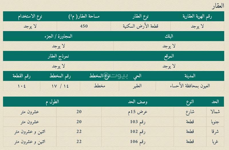 The location is fetched and verified by REGALocation Description as per Deed:حي العقير بمدينة العيون بمحافظة الأحساء .