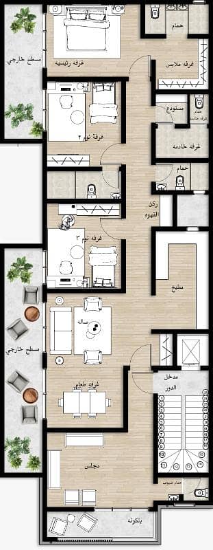Within the Atar Residence 06 housing project, this luxurious first floor is located in a prime area in the heart of Al Olaya, close to Al Olaya Main Street and the metro station.