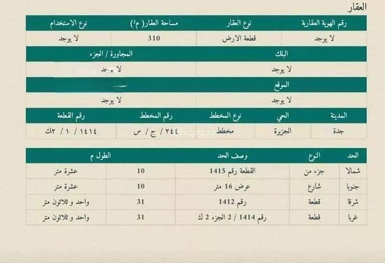 The location is fetched and verified by REGALocation Description as per Deed:قطعة الارض رقم 1414 / 1 الجزء 2 ك من المخطط رقم 244 / ج/ س الواقع فى حى الجزيرة بمدينة جدة .