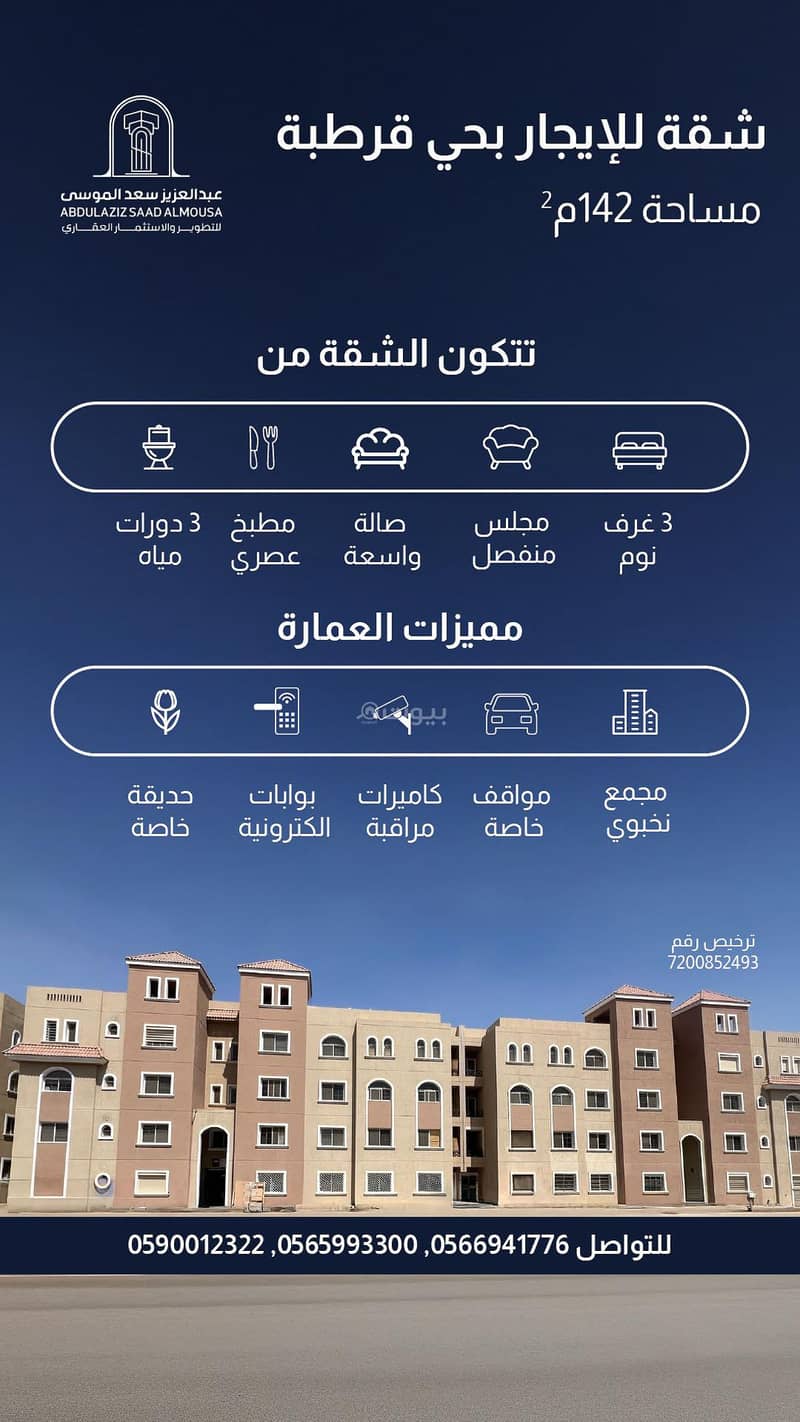 The apartment for rent is located in Section A on the third floor, featuring a total area of 142 square meters, carefully distributed to ensure maximum comfort and luxury. The apartment consists of 3 comfortable bedrooms, a separate guest reception, a spacious living room, a modern kitchen, and 3 bathrooms with high-quality finishes.