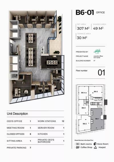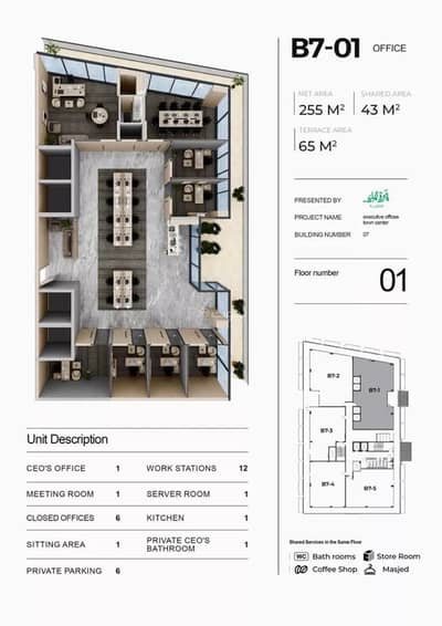 Office Features:• 5 Closed Offices• 1 Meeting Room• 10 Workstations• Lounge & Reception Area• Fully Equipped Kitchen• Server Room• Private Bathroom• 56 sqm Outdoor Terrace• 7 Parking Spaces