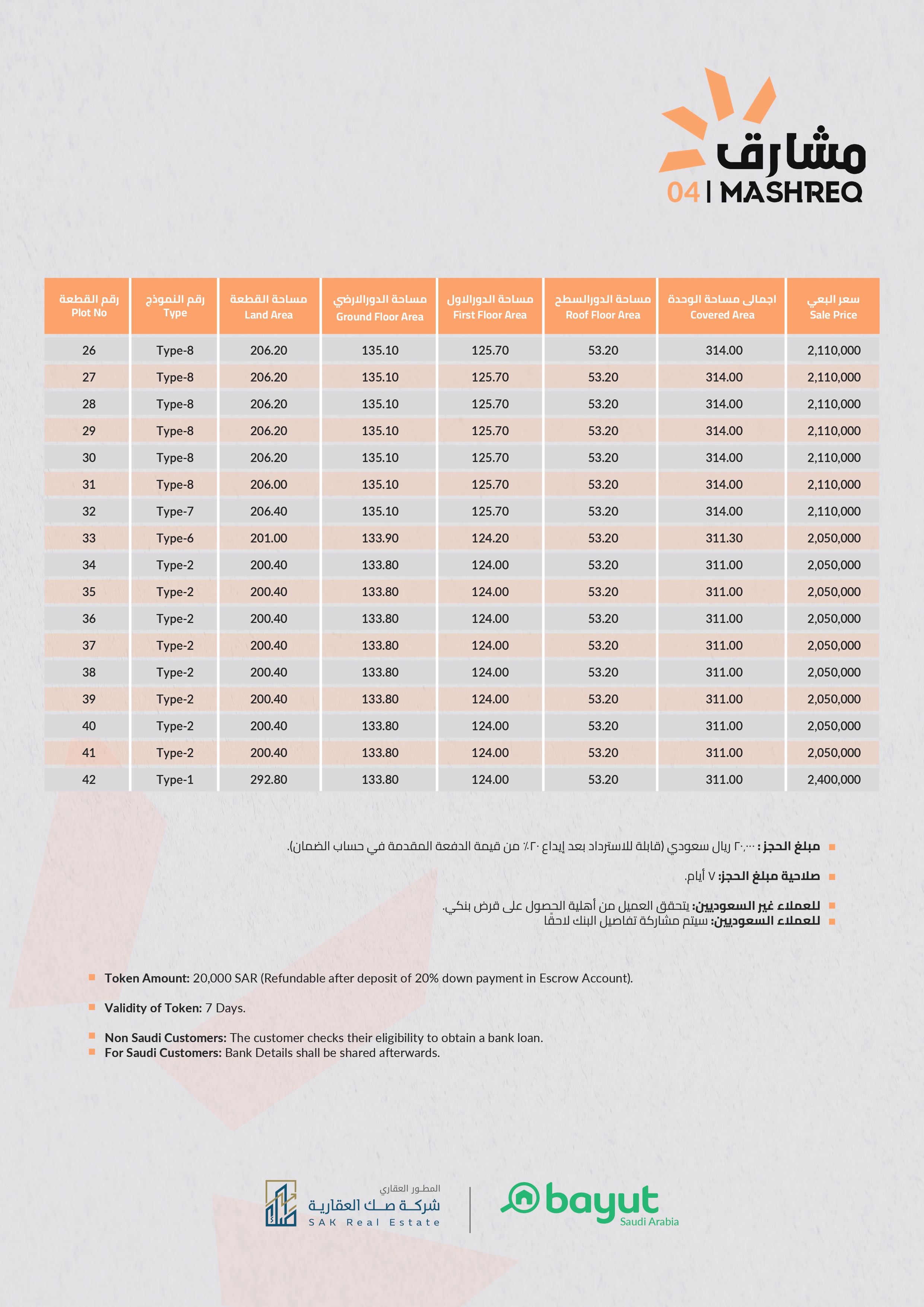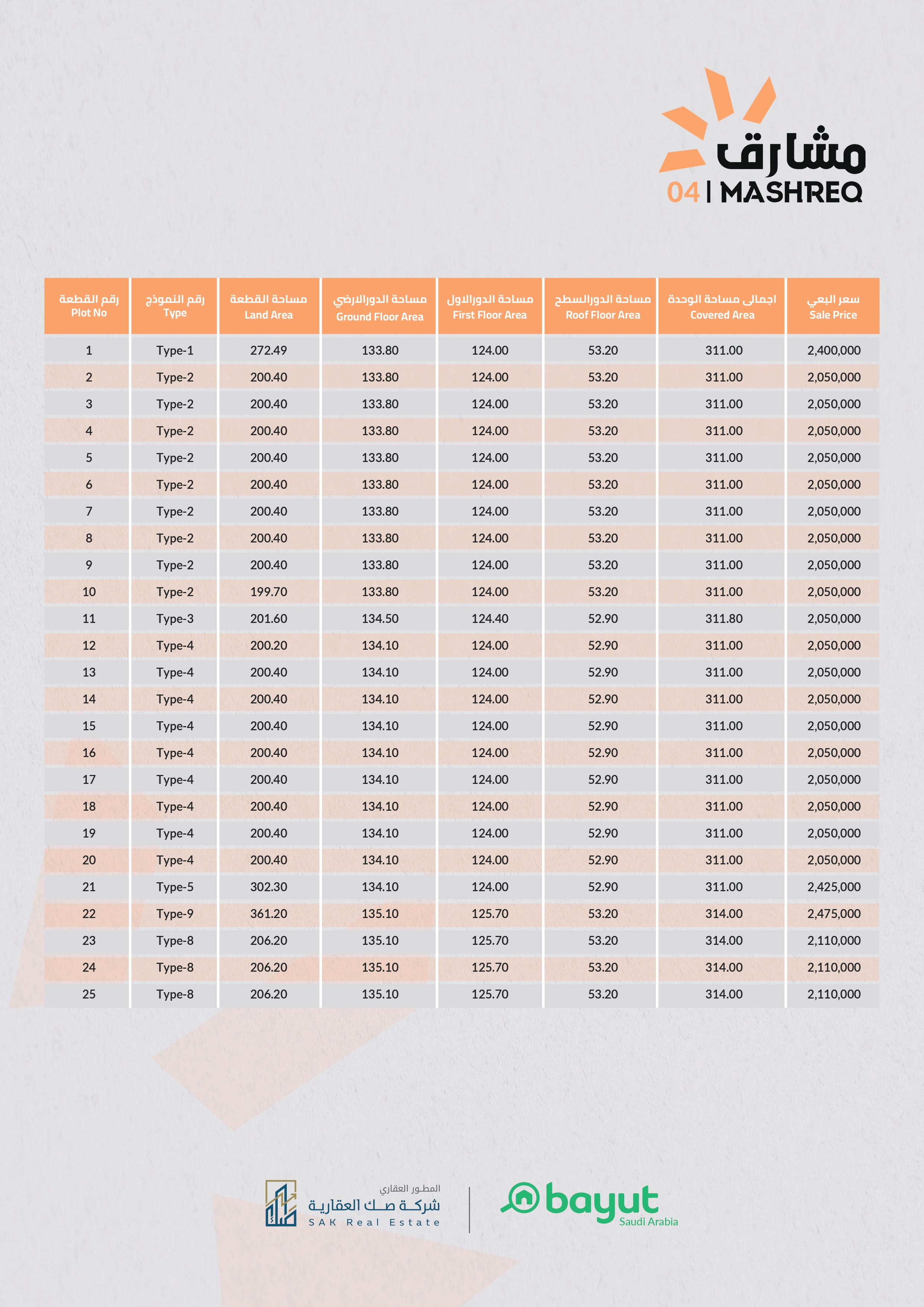 مشارق 4 هو مجموعة حصرية من منازل التاون هاوس الأنيقة، تجمع بين التصميم الفاخر ومساحات المعيشة الذكية والعملية، مما يوفر راحة الفلل المستقلة في بيئة مجتمعية متكاملة. صُممت كل وحدة تاون هاوس لتلبية احتياجات نمط الحياة المتغيرة للعائلات العصرية، وتتميز بتخطيط مكاني مدروس، وتشطيبات فاخرة، وأسلوب معماري راقي.